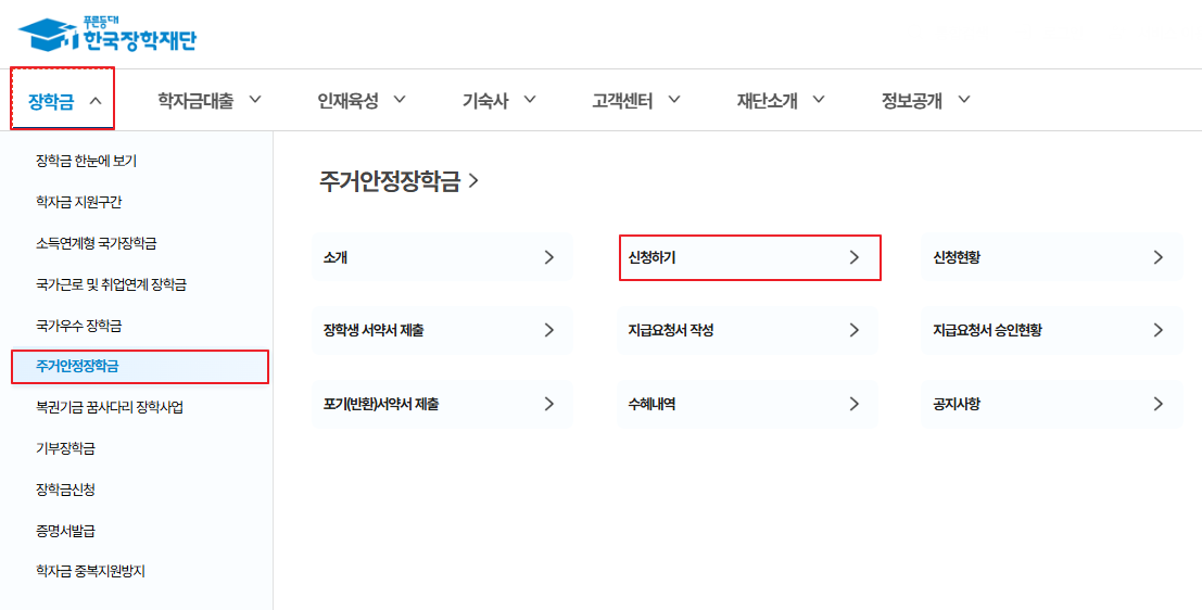 상단 메뉴에서 장학금 > 국가장학금 > 주거안정장학금을 선택한 뒤, 신청하기 버튼을 눌러주세요.
